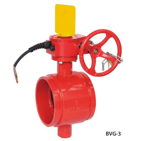 The BVG-1 and BVG-3 butterfly valves come complete with one internal supervisory position switch and one internal auxiliary switch. The supervisory/auxiliary switches operate by a cam connected to the valve stem and are designed to notify in the case of valve closure. Please refer to the relevant installation standard and Authority Having Jurisdiction. The switches will change position and close within two (2) full turns of the hand wheel from the fully open position.