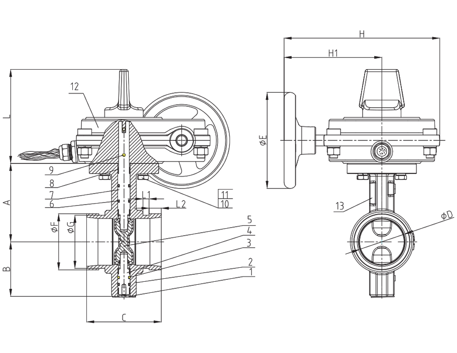 The butterfly valve should be connected to the piping system with approved couplings. Flow may be from either direction through the valve, and the valve may be positioned in any direction. The gearbox has been designed with a slow close handwheel operator that effectively minimizes water hammer during the opening or closing of valve during flow conditions. These valves feature minimum flow restriction and pressure loss when in the fully open position.
