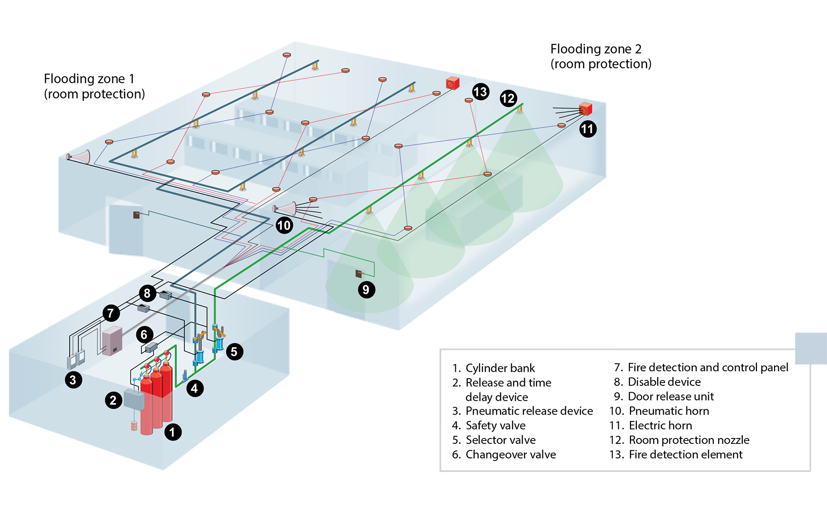 For the protection of special facilities, the nozzles are installed directly within the object, such as in electric switching cabinets, false floors for cables or machine tools. If several flooding zones are connected to a common extinguishing agent supply, the gas is released for each zone via selector valves.