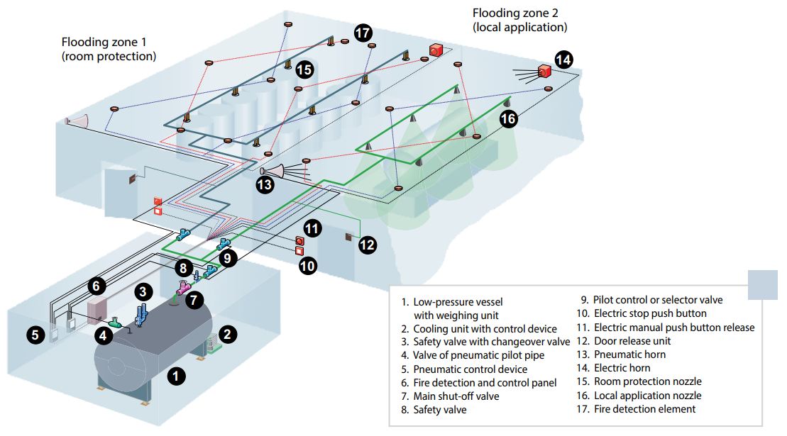 Carbon dioxide extinguishing systems are especially wellsuited for high risk areas, where, in the event of a fire, it is necessary to keep the protected objects available and functioning, to minimize operational interruptions after a fire, to prevent reactions between the burnt material and the extinguishing agent, to prevent damage from the extinguishing agent itself and to ensure effective extinguishing of objects in areas with difficult access (3-D extinguishing effect).