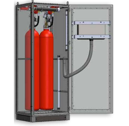 In pre-fabricated compact modules, all function-relevant components are combined with various functions in a single unit and accommodated in a protective cabinet, where they are protected from dust, moisture and mechanical damage. A compact module consists of a frame with freely suspended extinguishing gas cylinders, which are connected via pressure-proof hoses with the manifold, including weighing units with electronically monitored leakage indicators and an electromagnetic gas release.