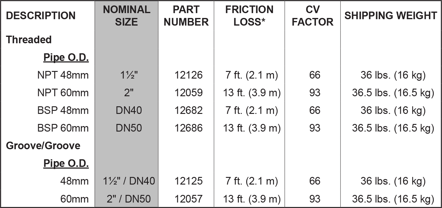 Table 1 - Valve Part Numbers and Specificationsa. Remove all plastic protectors from the openings of the Deluge Valve