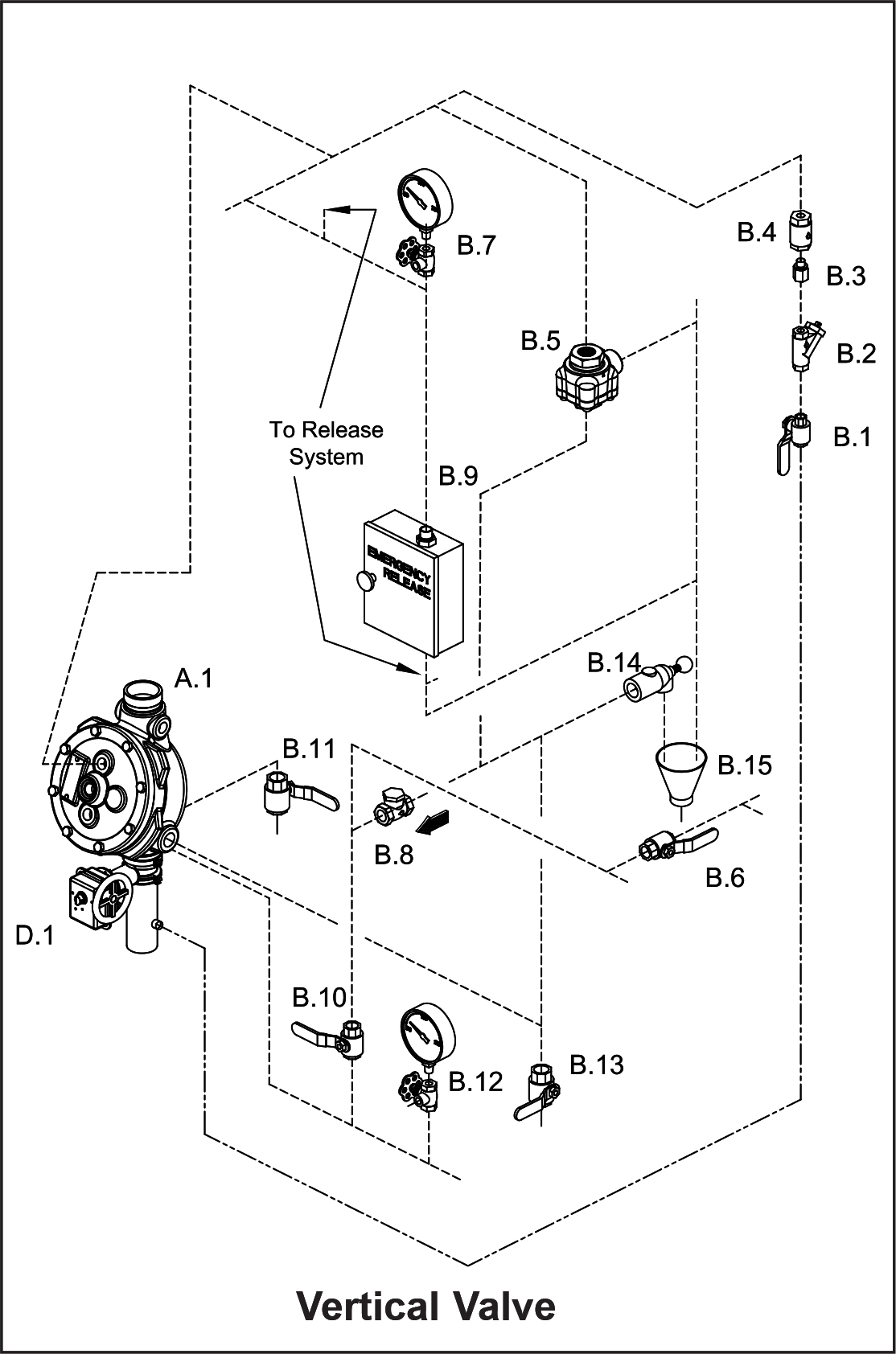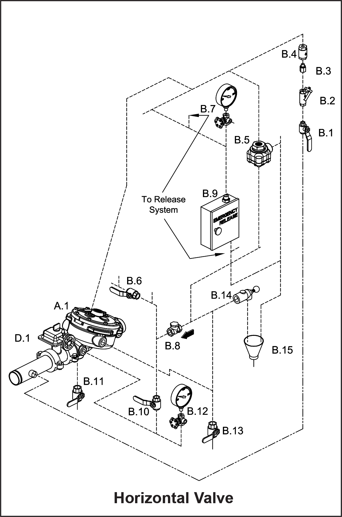 5. Verify that the Alarm Shut-off Valve (B.6) is OPEN, and the Alarm Test Valve (B.10) is CLOSED.
