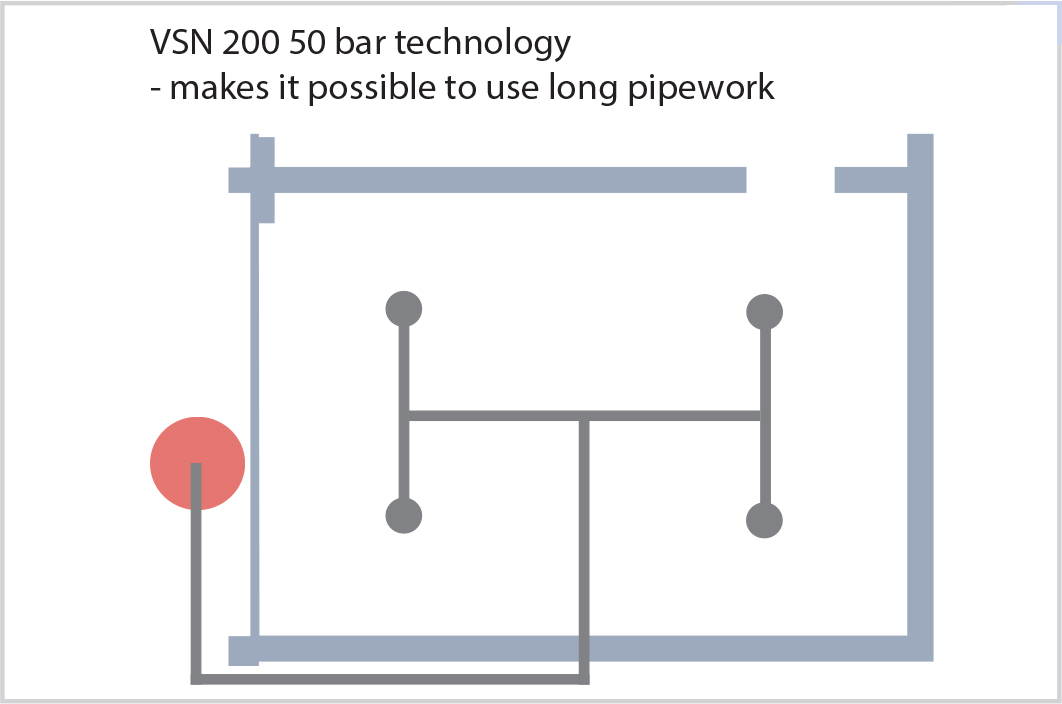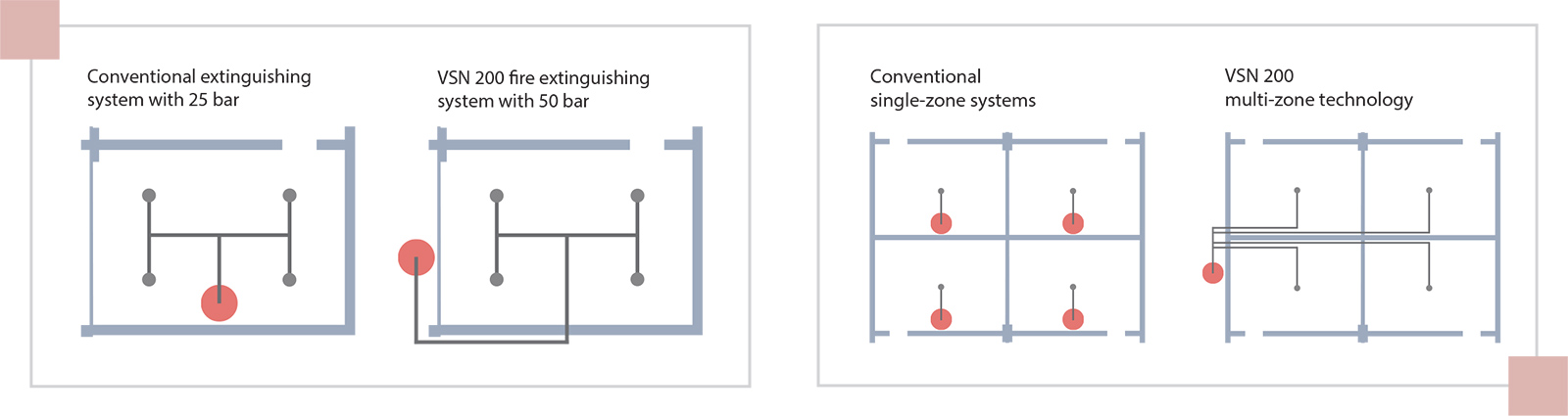 In addition to the operating pressures of conventional HFC-227ea fire extinguishing systems of 25 bar and 42 bar, VSN 200 systems are also available in a 50 bar configuration, which offers some significant advantages. For example, they can be adapted individually and tailored specifically to the requirements of the protected area.