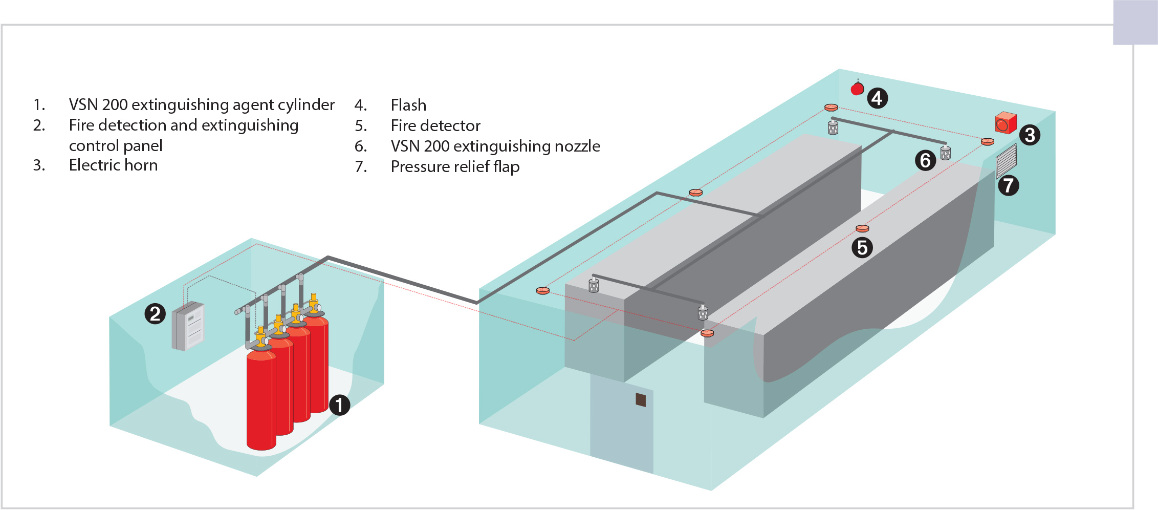 VSN 200 fire extinguishing systems are particularly suitable for the protection of spaces with electrical and electronic facilities, even if people are present in the premises.