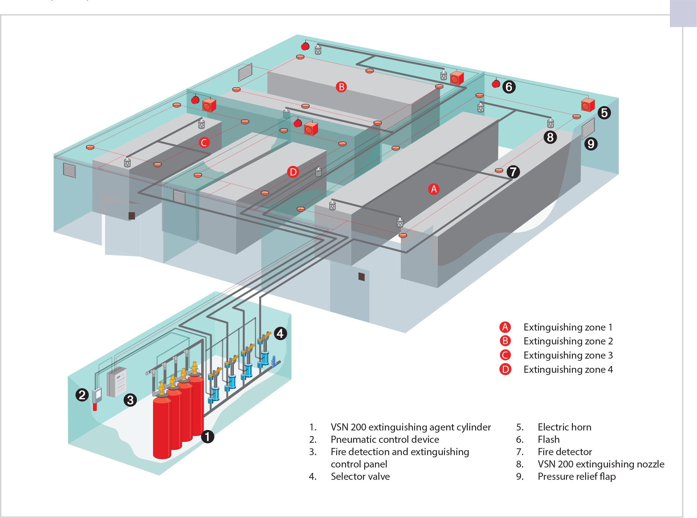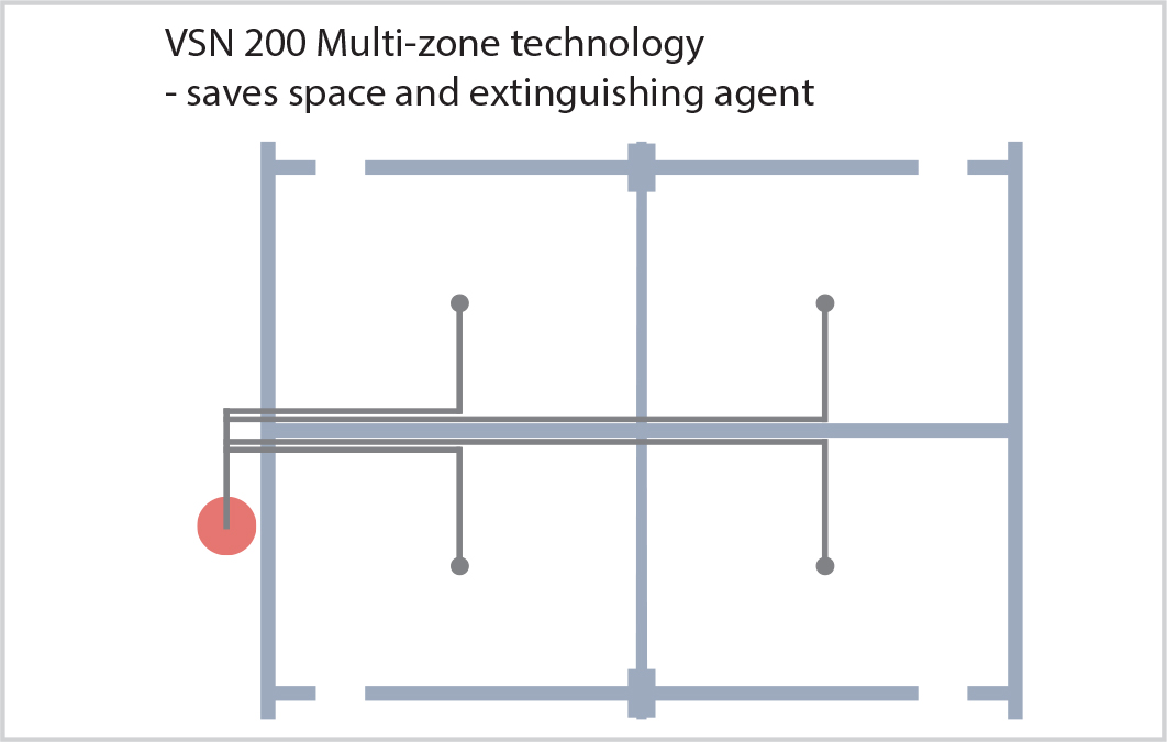 VSN 200 fire extinguishing systems can be designed for use as a single-zone system to protect a single protected area or in the form of a multi-zone system to protect two or more areas.